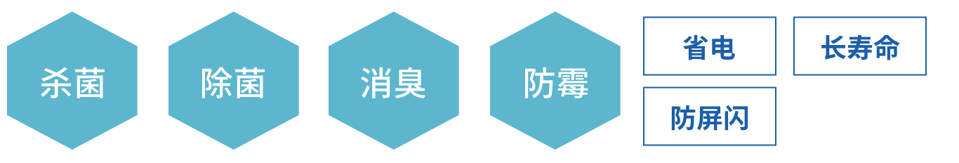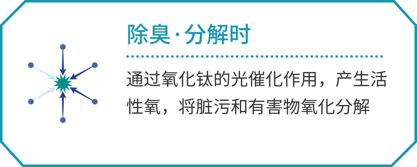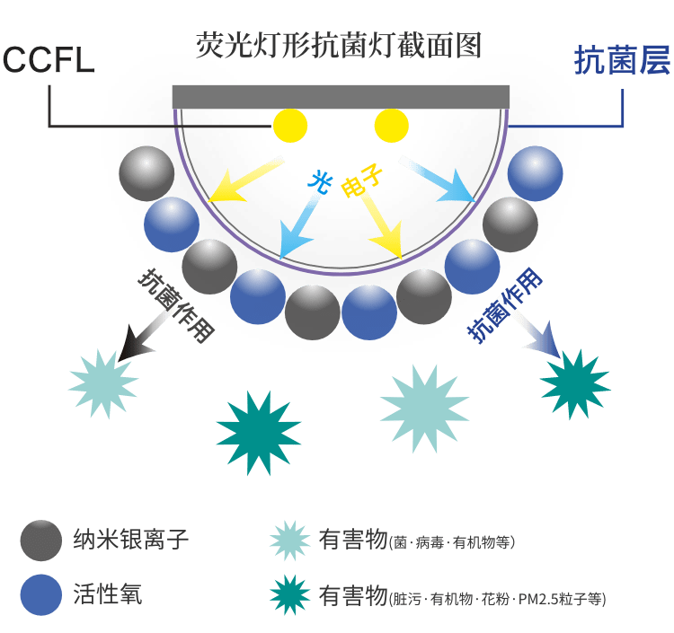 在抗菌灯的外罩表面均匀地涂了几层会产生纳米银离子的「纳米银」和能激活光催化效果的「氧化钛」,形成抗菌层。在这个抗菌层上,光与CCFL(冷阴极荧光灯管)发出的电子产生作用,发挥抗菌效果。