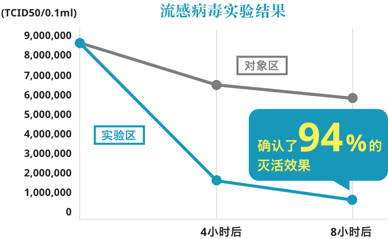 分别在距离实验液体30cm的抗菌灯照射实验区与非照射实验区进行0·4·8小时的静置实验,并分别测定病毒浓度。
