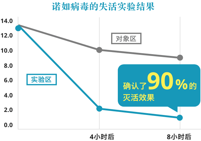 分别在距离实验液体30cm的抗菌灯照射实验区与非照射实验区进行0·4·8小时的静置,并分别测定病毒浓度。